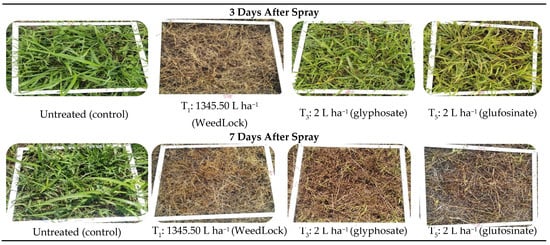 The efficacy of all herbicides was assessed as the impacts based on the visual injury of total weed composition in the experimental plots in the field. Visual injury assessment was conducted at 1, 3, 7, 14, 21, 28, 35, and 60 DAS, and it was found that the weed control percentage/injury level was influenced significantly (p ≤ 0.05) by the application of WeedLock, glyphosate isopropyl-amine, and glufosinate-ammonium compared to untreated (control) (Table 9). The visual injury scales of herbicide-treated plots were significantly greater than the untreated (control). At 1 DAS, plots treated with WeedLock in T1 (1345.50 L ha−1) and T2 (2691.00 L ha−1) exhibited severe damage with an injury scale rating 7.75 and 8.00, respectively, which were significantly different from other treatments. Similarly, at 3 DAS, T1 and T2 completely killed (100% control) all weed species with an injury rating scale of 9.00 over the other treatments (Figure 1). At 7 DAS, complete weed control was observed in all herbicide treatments. At 14 DAS, a reduction in weed control was starting to occur in WeedLock-treated plots, while glyphosate isopropyl-amine and glufosinate-ammonium remained highly effective. Further reduction in control efficacy was observed at 21 DAS and onwards in all herbicide treatments. However, the systemic herbicide glyphosate isopropyl-amine maintained its high efficacy, having a minimum of 70% weed control (injury scale of 7.00). On the other hand, both contact herbicides WeedLock and glufosinate-ammonium, experienced a great reduction in their control efficacy starting from 21 DAS onwards. Meanwhile, most of the weeds started to re-grow or recover from the herbicide injury at 60 DAS in all herbicide-treated plots. As a result, no significant differences were observed between the herbicide treatments and untreated (control).