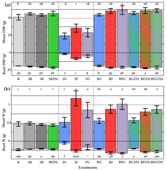 All statistical analyses and figures were obtained from R software [70]. The results presented in tables and figures are the means ± standard deviations (SDs) of four replicates. One- or two-way analysis of variance (ANOVA) followed by Tukey’s honestly significant difference (HSD) post hoc test was performed. In the case of non-normality of residuals or strong heterogeneity of variance, either outlier was removed, or analysis was undertaken using the Kruskal–Wallis test followed by the Conover post hoc test [71]. Thus, one of the reps of the R treatment with a leverage > 4 was removed from the root dry weight ANOVA of Figure 2a. The FG treatment was also removed from the amount of N in the root ANOVA of Figure 2b due to its much higher SD compared to other treatments. No transformation of data was applied except for the soil mineral N content, which was log-transformed prior to analysis of variance. One-sample Student’s t-test was also used to assess whether the RIIs were significantly greater or lower than 0.