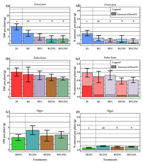 Above ground dry weight (a–c), and N (d–f) in service plants (g·plant−1). R: OSR (Brassica napus L. cv Avatar), F: Faba bean (Vicia faba L. cv Fanfare), G: Grass pea (Lathyrus sativus L. cv Merkur) and Ni: Niger (Guizotia abyssinica (L.f.) Cass.). Means of four replicates. Error bars are SDs. When one-way ANOVA had p < 0.05, the different letters a and b indicate significant differences across treatments (Tukey HSD).