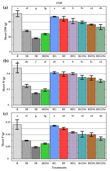 Dry weight (DW) (a), N (b) and P (c) in OSR shoots. R: OSR (Brassica napus L. cv Avatar), F: Faba bean (Vicia faba L. cv Fanfare), G: Grass pea (Lathyrus sativus L. cv Merkur) and Ni: Niger (Guizotia abyssinica (L.f.) Cass.). Means of four replicates. Error bars are SDs. For all the Kruskal–Wallis (a,c) and one-way ANOVA (b) tests p < 0.001, the letters a, b, c, d, e, and f represent the groups of significantly different modalities according to the Conover post hoc test (a,c) or the Tukey HSD test (b).