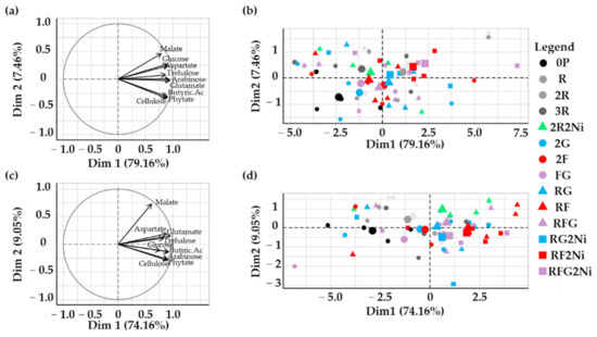 PCA based on SIR measurement of 12 substrates of the different treatments on the adherent soil (a,b) and bulk soil (c,d). The small points/triangle/scars represent the repetitions, and the large points represent the average of the four replicates of a treatment. R: OSR (Brassica napus L. cv Avatar), F: Faba bean (Vicia faba L. cv Fanfare), G: Grass pea (Lathyrus sativus L. cv Merkur) and Ni: Niger (Guizotia abyssinica (L.f.) Cass.). 0P: No plant. The detailed data are presented in Table S1 (Supplementary Materials). There was no significant difference between treatments.