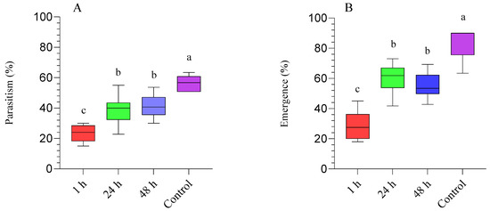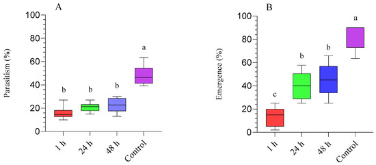 The parasitism rate by T. radiata showed a significant difference between the control and the treatment consisting of spraying the fungal suspension at 1, 24, and 48 h before parasitism (F3.36 = 62.71; p < 0.0001) (Figure 3A). However, no significant differences were observed when T. radiata was parasitized at 1, 24, and 48 h after the fungal suspension application (p = 0.9526). The parasitism rates at 1, 24 and 48 h were 16%, 20% and 22%, respectively.