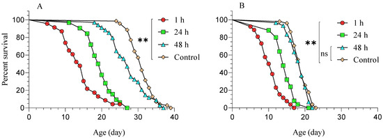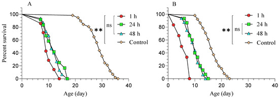 The values of the survival rate of T. radiata females and males are plotted in Figure 2. Results showed that when applying B. bassiana after parasitism, the median survival time of T. radiata females was significantly reduced (p < 0.0001), from 31 days in the control to 14, 20 and 27 days at 1, 24 and 48 h, respectively (Figure 2A). The median survival time of T. radiata males was also significantly reduced (p < 0.0001), from 19 days in the control to 11 and 14 days at 1 and 24 h, respectively. Meanwhile there were no significant differences (p = 0.3208) between the male median survival in the control and at 48 h of parasitism, with the median survival time of 19 days seen in both treatments (Figure 2B).