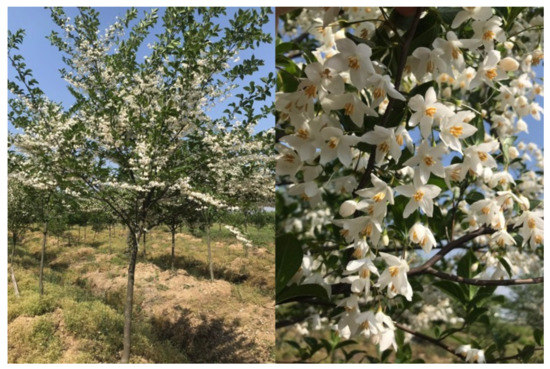 Plant material was collected and processed at the Jiangsu Guoxing Biotechnology Co. Ltd., located in Luhe District, Nanjing, China (32°54′ N, 118°50′ E) in 2019. The average temperature, length of the day, and rainfall per year were 15.3 °C, 2200 h, and 970 mm, respectively. S. japonicus blooms in late April and quickly enters the blooming stage with white flowers (Figure 1). Nine-year-old S. japonicus trees originating from Yichang, Hubei Province, were used in our experiment. These plants grew in natural conditions, and no fertilizer was used. Ten trees with similar height, growth, and development conditions were selected and tagged. Hence, each tree was regarded as one biological repetition. S. japonicus bloomed with stamens and pistil exposed at first, and then stigma exerted with bright anthers. Stigma, anthers, and petals were dry when flowers began to fall. Its flowering period was divided into three stages, including initial flowering (5% of the flowers on a flowering tree blossomed), full flowering (50% of the flowers on a flowering tree blossomed), and end flowering (95% of the flowers on a flowering tree blossomed).