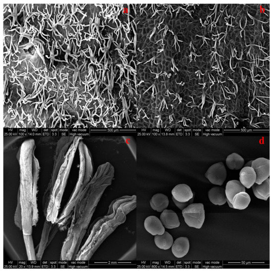 Structure of S. japonicus flowers at full flowering stage. (a) upper surface of petals; (b) lower surface of petals; (c) anthers; (d) pollens.