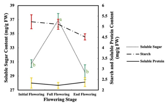 To analyze the contents of soluble sugar, starch, and soluble protein in S. japonicus petals at different flowering stages, we applied one-way analysis of variance and found an ‘A’ pattern in the change of soluble sugar content (Figure 3). The content at the full flowering stage (36.91 mg/g FW) was significantly higher than at the initial flowering and end flowering stages; however, the contents at these two stages were very close (30.77 mg/g FW and 29.54 mg/g FW, respectively). Starch content displayed a continuous decreasing trend from the initial flowering to end flowering stages (Figure 3). As shown in Figure 3, the content of soluble protein at the initial flowering stage was 2.33 mg/g FW and then decreased to 2.22 mg/g FW at the full flowering stage. Soluble protein content exhibited a ‘decrease-increase’ trend and reached the maximum at the end flowering stage (2.37 mg/g FW). No significant differences were found among the three stages.