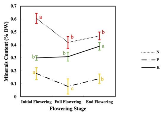 The content of N at the initial flowering stage was significantly higher than at the full flowering and end flowering stages (Figure 4). With regard to P, the highest contents appeared at the initial flowering stage, and the lowest contents appeared at the full flowering stage, so the change trends of the content were ‘decrease-increase’ patterns (Figure 4). The contents of K at the initial flowering and full flowering stages were 0.30% DW and 0.31% DW, respectively, with no significant difference. Whereas the content at the end flowering stage was 0.39% DW, which was a significant difference from those at the other two stages (Figure 4).