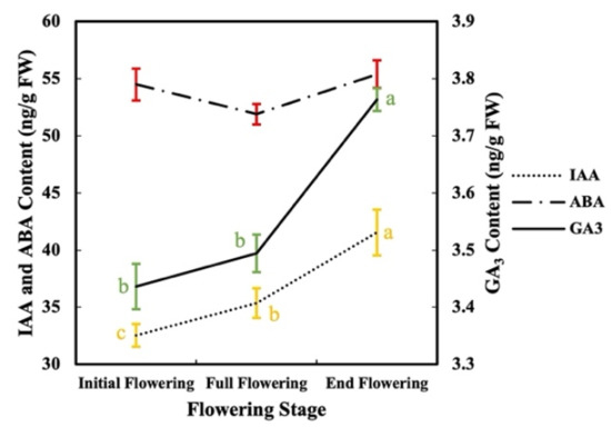 GA3 content increased continuously during the flowering period (Figure 5), and the difference between the full flowering and end flowering stages was significant (3.49 ng/g FW and 3.76 ng/g FW, respectively). The content of GA3 increased slightly at the early stage and increased sharply at the late stage. The content of IAA increased continuously, and the difference among the three flowering stages was significant (Figure 5). The contents of ABA were more abundant at the initial flowering (54.50 ng/g FW) and end flowering (55.40 ng/g FW) stages than at the full flowering (51.90 ng/g FW) stage; however, no significant difference was observed among the three stages (Figure 5).