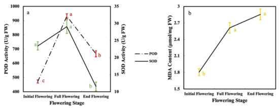 The activity of POD ascended significantly from the initial flowering (472.17 U/g FW) to the full flowering (930.99 U/g FW) stage and thereafter descended significantly at the end flowering (666.16 U/g FW) stage (Figure 6a). The activity of POD at the full flowering stage was 97.2% higher than at the initial flowering stage. Figure 6a shows an ‘increase-decrease’ trend of the activity of SOD. Although there were no significant differences between the initial flowering and full flowering stages (23.43 U/g FW and 29.08 U/g FW, respectively), SOD activity at the end flowering (11.52 U/g FW) stage was significantly lower than those at the former two stages. MDA contents at the full flowering (2.61 μmol/mg FW) and end flowering (2.86 μmol/mg FW) stages were very close with no significant differences; however, they had significant differences with MDA content at the initial flowering (1.81 μmol/mg FW) stage. The changing pattern of the content of MDA rose continuously (Figure 6b).