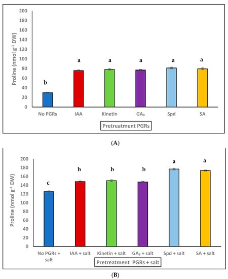 The osmolyte Pro increased under high salt concentrations [18]. Figure 2A shows the accumulation of Pro in F. pulverulenta leaves grown with pretreatment PGRs. The maximum values were observed with all PGRs, whose values increased 2.6-fold when compared to non-treated plants (no PGRS). The increase in Pro at 300 mM NaCl was 4.2-fold when compared to the values of Pro (no PGRs) (Figure 2A,B). Pretreatment (Spd + salt) and (SA + salt) resulted in higher values of Pro content (Figure 2B), and a 1.4-fold increase compared to plants grown only with salt.