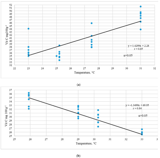Similarly, a high correlation of vitamin C accumulation in black currant berries under the influence of high air temperatures during the harvest season has been reported earlier [29,30].