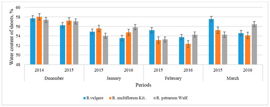 Changes in the water content in annual shoots of different red currant species during the winter months of 2014–2016. To compare the differences for each month and separately for each species, t-test was used.