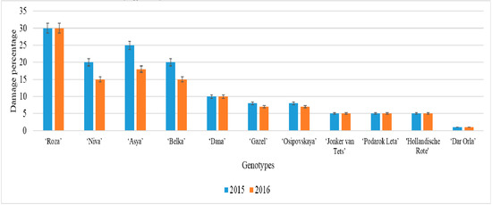 During the experiments, the results of the laboratory studies of the resistance of cultivars to low temperatures were compared with field observations. According to the results of the field observations, the cultivars of the early ripening period ‘Asya’ and ‘Niva’ as well as of the middle ripening period’ Roza ‘and’ Belka’, belonging to the species R. vulgare Lam., had a high percentage of damage to some flower buds and annual shoots, while perennial shoots were not significantly damaged by low temperatures (Figure 5).