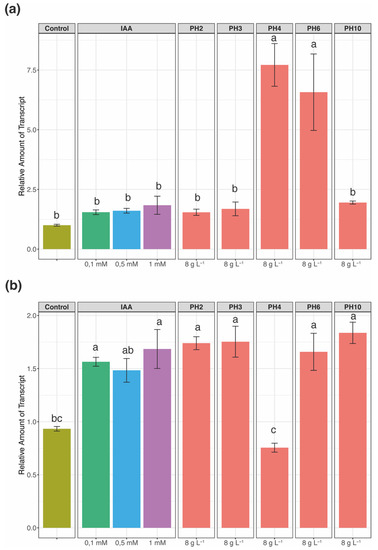 Figure 2. Quantitative RT-PCR analyses of selected IAA-responsive transcription factors. (a) SlIAA2 and (b) SlIAA9. The assessment was carried out on leaf tissue of tomato plants at 7 days after treatments. The data were normalized to the Elongation Factor 1α housekeeping genes. The relative expression ratios were calculated using control plants as a calibrator sample. The values reported are means SE of three biological replicates. Different letters indicate significant differences according to one-way ANOVA with Tukey post hoc tests (p < 0.05).