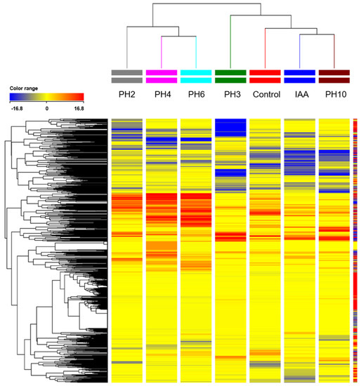 Figure 3. Unsupervised hierarchical cluster analysis (HCA) carried out from UHPLC-ESI/QTOF-MS metabolomics analysis of tomato leaves treated with protein hydrolysate (PH) applications. Indole-3-acetic acid (IAA 1 mM) was used as positive control. The fold-change-based heat map was used to build hierarchical clusters (linkage rule: Ward; distance: Euclidean).