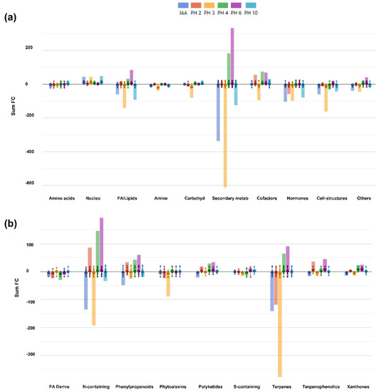 Figure 4. Summary of the biosynthetic pathways (a) and secondary metabolism (b) processes affected by protein hydrolysates (PHs) applications. The dataset produced through UHPLC-ESI/QTOF-MS was subjected to volcano plot analysis (p < 0.01, fold-change > 3) and all the differential metabolites elaborated with the PlantCyc Pathway Tool (https://www.plantcyc.org, accessed on 24 March 2020). Five biological replicates were analysed for each treatment. Indole-3-acetic acid 1 mM (IAA) was used as positive control. The x-axis represents each set of subcategories while the y-axis corresponds to the cumulative fold-change that is depicted by the height of the bar. Each dot represents the individual log FC of a single compound. The large dots are the average (mean) of all data values for metabolites within the same subcategory. Nucleo: nucleoside and nucleotide biosynthesis; FA/Lipids Syn: fatty acid and lipid biosynthesis; Amine Syn: amine and polyamine biosynthesis; Carbohyd: carbohydrate biosynthesis; Secondary metab: secondary metabolite biosynthesis; Cofactors: cofactor, prosthetic group, electron carrier, and vitamin biosynthesis; Other: other biosynthesis. FA Derivs: fatty acid derivative biosynthesis; N-containing: N-containing secondary metabolites; S-containing: S-containing secondary metabolites.