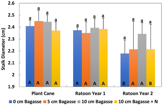 Stalk diameter for plant cane and two ratoons (mean and standard deviation). Different lower case letters within the same crop year are significantly different (p < 0.05). The same treatment with different upper case letters for plant cane and two ratoons are significantly different (p < 0.05).