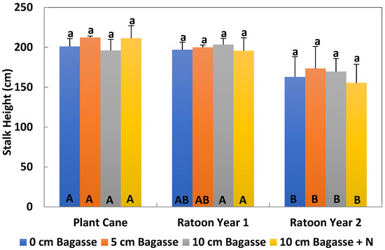 Stalk height for plant cane and two ratoons (mean and standard deviation). Different lower case letters within the same crop year are significantly different (p < 0.05). The same treatment with different upper case letters for plant cane and two ratoons are significantly different (p < 0.05).