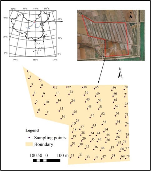 The Hetao Irrigation District is a typical arid irrigation region, and it is very important to the agricultural development of Inner Mongolia, a region in northern China. It is one of China’s three largest irrigation districts and is an important food supply base []. The precipitation in this area is much lower than the crop water requirement. Irrigation is necessary for agriculture in this area. More than 75% of the basin is irrigated using Yellow River water. The average water diversion from the Yellow River is about 5.165 billion m3/year (from 1980 to 2000), which accounts for about 1/10 of the annual discharge of the Yellow River [,]. Long-term irrigation has resulted in salinization, which is becoming increasingly serious []. Knowing the spatial distribution of the soil salinity is crucial to precise fertilization and irrigation. The method most commonly used to study the spatial distribution of soil salinity is remote sensing [,]. However, the remote sense method mainly focuses on large-scale areas. Understanding the spatiotemporal characteristics of soil salinity is necessary for both large regions and the field scale. The spatial distributions of the soil salinity and crop canopy coverage are consistent at the field scale []. Thus, the field scale prediction of soil salinity may be more helpful for farmers when planning fertilization and irrigation. A detailed understanding of the spatiotemporal variability of soil salinity is helpful in agriculture regionalization at the regional scale. For example, where to plant salt tolerance crops and plant high yield crops without salt tolerance.
