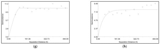 Semivariagrams for the considered soil properties. (a)Total salt concentration (TSC) for 0–20 cm, (b) TSC for 20–40 cm, (c) pH for 0–20 cm, (d) pH for pH 20–40 cm, (e) Sodium adsorption ratio (SAR) for 0–20 cm, (f) SAR for 20–40 cm, (g) Soil organic matter (SOM) for 0–20 cm, and (h) SOM for 20–40 cm.
