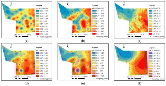 Spatial prediction of the pH in the different soil layers obtained using different methods. The (a–c) mean the IDW, OK, and CK methods for 0–10 cm. The (d–f) mean the IDW, OK, and CK methods for 10–20 cm.