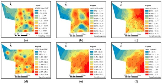 Spatial prediction of the SOM in the different soil layers obtained using different methods. The (a–c) mean the IDW, OK, and CK methods for 0–10 cm. The (d–f) mean the IDW, OK, and CK methods for 10–20 cm.