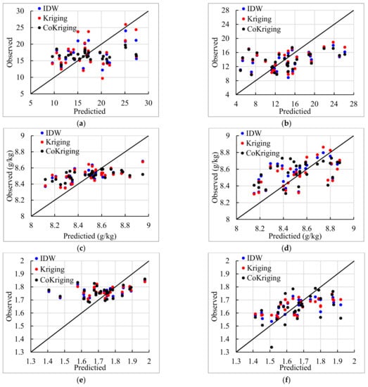 For the TSC of the surface layer, the cokriging method performed the best, but the kriging method performed the best (Table 5). For the pH and SAR of the surface layer and the SOM in both layers, the IDW method performed the best. For the pH and SAR of the subsurface layer, the kriging and cokriging performed the best, respectively. The scatter plot shows that the TSC for both layers, the pH for the subsurface layer, and the SOM for the surface layer exhibited a more decentralized trend (Figure 7), indicating the larger uncertainty of the prediction.