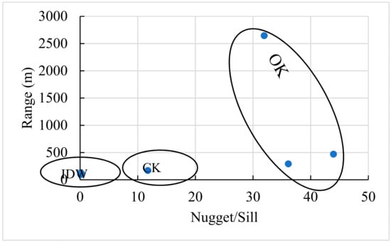 Many researchers have evaluated the performances of the different interpolation methods. The results almost always differ. In a newly reclaimed area in the southern part of the Behera Governorate of Egypt, the IDW method outperformed the other methods, including the ordinary kriging, regression kriging, and cokriging methods []. In the agricultural coastal areas of northern Iran, the OK method had the minimum error compared with the IDW and conditional simulations methods []. In the southern part of the Arkansas River Basin in Colorado, USA, the performances of the different geostatistical models were as follows: ordinary kriging > regression kriging > cokriging []. In other words, the applicability of the spatial prediction methods to a specific soil in a specific region are still unknown. In our study area, different methods were found to be optimal for the different soil properties and soil layers (Table 5). We found that the optimal methods are closely related to the relationship between the nugget/sill value and the range of the considered soil properties values (Figure 8). The soil properties with lower nugget/sill values and smaller ranges are best predicted using the IDW method. The soil properties with intermediate nugget/sill values and value ranges are best predicted using the CK method. The soil properties with higher nugget/sill values and larger ranges are best predicted using the OK method. This may be caused by the different calculation methods used by the different prediction methods. The kriging method is a function of the statistical stationarity, while the IDW is a function of the distance between the sampling points []. When both the nugget/sill value and the range are lower, the property has a strong spatial dependence in a short distance. This condition may be more in accord with the assumptions of the IDW method.