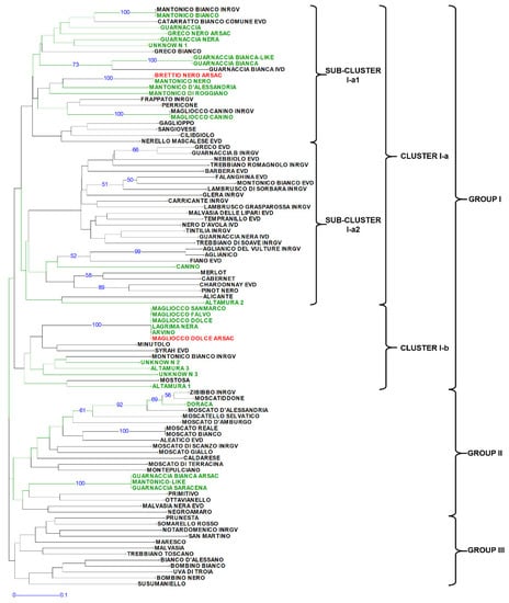 Group I split into two sub-clusters (I-a and I-b) containing, respectively, 50 and 14 accessions. The cluster I-a may be in turn divided into two sub-cluster (I-a1 and I-a2). The sub-cluster I-a1 contained most of the Calabrian accessions, highlighting several cases of homonymies and synonymies (Table S1). The samples Guarnaccia and Guarnaccia Nera showed a different profile compared with Guarnaccia Nera present in the Italian Vitis database, indicating a possible case of misnaming. Mantonico Nero and Brettio Nero shared identity, showing also a high similarity with Mantonico d’Alessandria and Mantonico di Roggiano. The samples named Guarnaccia Bianca and Guarnaccia Bianca-like clustered with the Guarnaccia Bianca registered into the Italian Vitis database but differed from Guarnaccia Bianca present in the Italian National Registry of Grape Varieties. A similar discrepancy was observed for the variety Montonico Bianco in the Italian National Registry of Grape Varieties and the European Vitis database, located in cluster I-b and sub-cluster I-a2, respectively. The accession Greco Nero provided by ARSAC showed a different profile compared with Greco Bianco indicating misuse of the same name followed by “Bianco” and “Nero” designation to indicate different varieties.