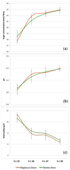 Ripening curves referred to sugar concentration, pH, and total acidity were built for both Magliocco Dolce and Brettio Nero varieties. Analysis was performed on berries collected at 4 distinct stages of ripening: beginning of veraison (E-L 35), middle veraison (E-L 36), end of veraison (E-L 37), and maturity (E-L 38). Samples were collected for three seasons (2016–2018). Moreover, the following parameters were measured in berries at maturity: total anthocyanins were measured in the skin, total flavonoids, total polyphenols, proanthocyanidins, and flavans were estimated in skin and seed, and hydroxycinnamic acids were measured in the pulp. These compounds were determined by spectrophotometric methods [46]. Analysis was performed for two seasons (2016–2017).