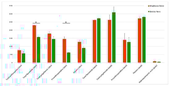 In general, Magliocco Dolce showed higher levels of polyphenolic compounds in the skin compared to Brettio Nero, in particular, a significant difference was observed for total flavonoids and proanthocyanidins (p < 0.05), whereas the levels of polyphenolic compounds were comparable between the two varieties in the seed. Finally, hydroxycinnamic acids in berry pulp were slightly lower in Brettio Nero compared to Magliocco Dolce.