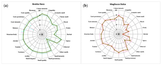 Brettio Nero (a) and Magliocco Dolce (b) monovarietal wine sensorial profiles based on 24 parameters evaluated by consumer volunteers.