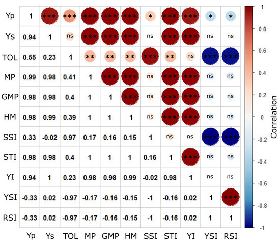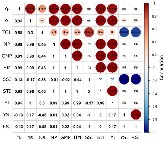 Correlation coefficients (r) and correlogram for the grain yield and stress screening indices. Ns—not significant, *, ** and ***—significant at the level of probability p < 0.05, 0.01 and 0.001, respectively.