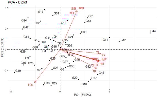 PCA biplot for the grain protein content based on the first (PC1) and the second (PC2) principal components for the wheat cultivars (G1–G48) and different stress tolerance indices.