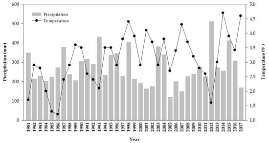 Annual mean precipitation and temperature from 1981 to 2017 in the study site.