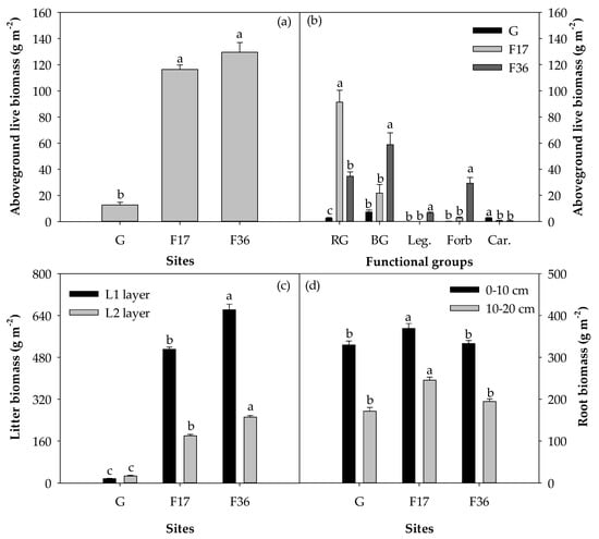 Variations in (a) aboveground live biomass, (b) aboveground live biomass of rhizome grass (RG), bunchgrass (BG), legume (Leg.), forb (Forb) and carex (Car.), (c) litter biomass (L1 and L2 layers) and (d) root biomass (0–10 and 10–20 cm) among free grazing (G), 17 (F17) and 36 years of fencing (F36) treatments. The values (mean ± SE) are means of five blocks; the same letters above the bars indicate no significant difference at the 0.05 level.