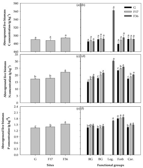 Variations in (a) aboveground live biomass C concentration, (b) aboveground live biomass C concentration of rhizome grass (RG), bunchgrass (BG), legume (Leg.), forb (Forb) and carex (Car.), (c) aboveground live biomass N concentration, (d) aboveground live biomass N concentration of five plant functional groups, (e) aboveground live biomass P concentration, (f) aboveground live biomass P concentration for five plant functional groups among free grazing (G), 17 (F17) and 36 years of fencing (F36) treatments. The values (mean ± SE) are means of five blocks; the same letters above the bars indicate no significant difference at the 0.05 level.