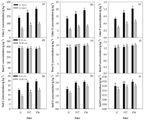 Variations in (a) litter C concentration (L1 and L2 layers), (b) litter N concentration (L1 and L2 layers), (c) litter P concentration (L1 and L2 layers), (d) root C concentration (0–10 and 10–20 cm), (e) root N concentration (0–10 and 10–20 cm), (f) root P concentration (0–10 and 10–20 cm), (g) soil C concentration (0–10 and 10–20 cm), (h) soil N concentration (0–10 and 10–20 cm), (i) soil P concentration (0–10 and 10–20 cm) among free grazing (G), 17 years of fencing (F17) and 36 years of fencing (F36) treatments. The values (mean ± SE) are means of five blocks; the same letters above the bars indicate no significant difference at the 0.05 level.