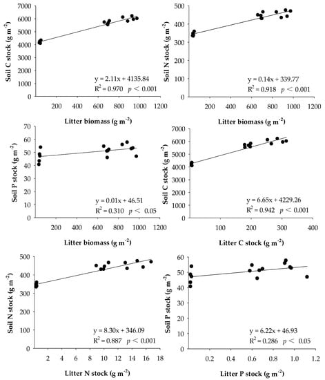 Based on the stepwise regression analysis, the litter biomass was positively correlated with soil C, N and P stocks (p < 0.05). In addition, the C, N and P stocks of litter biomass were also significantly positively correlated with soil C, N and P stocks, respectively (p < 0.05; Figure 5).