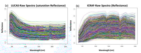 Raw soil spectra for both datasets showing the reflectance against wavelength (nm): (a) LUCAS-ESDAC (19,967 samples); (b) ICRAF-ISRIC (4438 samples).