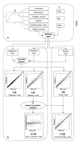 Methodology flowchart: (a) the five pre-processing techniques; (b) machine learning models calibration including data splitting into three sets: calibration (70% of data), validation (15% of data) and testing (15% of data) and linear correction of biased residuals to predict the three soil texture fractions (sand, silt, and clay %).