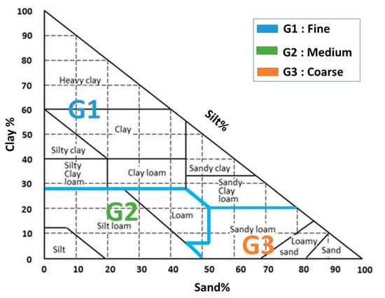 Since both soil libraries ICRAF and LUCAS contain the spectral and chemical measurements of soils, we used the seven available chemical measurements (NTotal, Pavailable, Kexchangeable, Caexchangeable, Mgexchangeable, CaCO3, pHwater, OC) for LUCAS and the five available measurements (Kexchangeable, Caexchangeable, Mgexchangeable, pHwater, OC) for ICRAF. The inclusion of these chemical measurements in the spectral measurements in the calibration model is intended to enhance the performance of the textural group prediction. In contrast to the predictions of the size fractions (clay, silt, and sand), which are quantitative features and have shown a better affinity with regression algorithms such as MLP and CatBoost, the textural groups (G1, G2, and G3) are categorical variables, which require classification algorithms, such as the light gradient boosting machine (LightGBM). The LightGBM is a model applying gradient-based one-side sampling (GOSS) and exclusive feature bundling technologies [4]. Unlike the conventional GBM tree splitting method, LightGBM uses the GOSS method to identify the observations that can be used for computing the split. LightGBM has the advantages of reducing memory usage while increasing the training speed. In addition, it produces much more complex trees by following a leaf-wise split approach rather than a level-wise approach, which is the main factor in achieving higher accuracy, and it is capable of handling large-scale data. LightGBM contains two novel techniques, namely gradient-based one-side sampling and exclusive feature bundling, to deal with large numbers of data instances and large numbers of features, respectively [41]. We used this algorithm to train predictive models for classification of the three textural groups of soil. Many research studies have used auxiliary information derived from different data sources to improve the prediction of soil properties [42,43]. Textural groups are based on the Canadian system of soil classification (Figure 3).