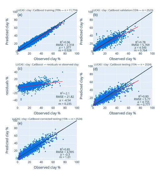 Prediction accuracy of clay content from LUCAS and ESDAC datasets: (a) training; (b) validation; (c) the residual bias correction bias to be used in the testing model; (d) testing without bias correction; (e) testing with bias correction. The black line refers to the 1:1 line, and the red line refers to the regression line.
