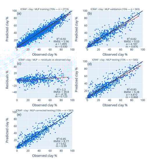 Figure 4 shows all clay prediction results for the ICRAF dataset. These are the four criteria of prediction performance through the linear regression between the predicted and measured values in the training (Figure 4a), validation (Figure 4b), and testing (Figure 4d) datasets. In the same figure, the linear bias on the residuals of the validation dataset (Figure 4c) was used to correct the results in the testing dataset (Figure 4e). Accounting for the linear bias of the prediction residuals (predicted vs. measured residuals) as a function of the percentage of clay according to the equation Y = 0.235X–4.54 (Figure 4c), the predictions were improved significantly. Compared to the validation results (Figure 4b), the linear bias correction helped to increase the R2 by 0.07, the slope m by 0.24, and sensitivity or intercept a by 4%. In Figure 4e, prediction in the corrected testing can be seen to reach a robustness R2 of 0.85, an m value close to 1, and sensitivity close to zero. It is therefore clear that the linear bias correction proposed by Song [40] improves the performance criteria for clay prediction from vis-NIR spectra. Curiously, the prediction results were almost the same for the LUCAS database (Figure 5) and the ICRAF database (Figure 4). Similarly, the prediction results for LUCAS in the corrected testing reached the same levels of R2 robustness of 0.85, m of 0.99, and sensitivity, a, of 0.62% (Figure 5e).