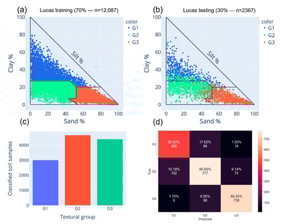 Prediction texture triangles (following the Canadian system of soil classification) obtained from LightGBM algorithm for the LUCAS dataset: (a) calibration data (n = 12,087); (b) testing data (n = 2367); (c) normalized confusion matrix of the training dataset; (d) normalized confusion matrix of testing dataset obtained for the 3 textural groups.