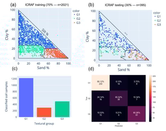 Prediction texture triangles (following Canadian system of soil classification) for obtained from the LightGBM algorithm for the ICRAF dataset: (a) training data (n = 2021); (b) testing data (n = 395); (c) normalized confusion matrix of the training dataset; (d) normalized confusion matrix of testing dataset obtained for the 3 textural groups.