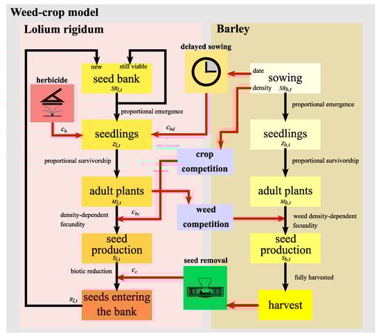 Scheme of L. rigidum–barley model, considering the life cycles of both populations and the weed control actions. Both interspecific and intraspecific competitions are included. Black arrows indicate the course of changes through the different stages in the life cycles of the weed and the crop. Red arrows represent the control and competitive interventions.