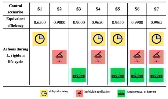 Different control scenarios combined with both standard and high barley sowing densities to control L. rigidum are evaluated. Actions such as delayed sowing, herbicide application and seed removal at harvest are considered in this scheme. The obtained programs are organized so that the equivalent efficiency increases gradually.