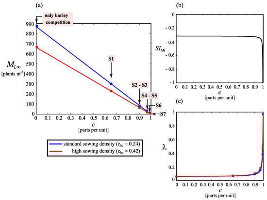 The weed population growth rate (Equation (13)) presents a similar dependence on the control actions. This rate is practically constant for control efficiencies lower than 0.90 while it increases sharply for control efficiencies greater than 0.90 (Figure 3c). For control programs S1−S3, the λ values are almost the same, keeping below 0.1, and they do not manifest differences concerning the sowing density options. This implies that goes to the equilibrium with a predominantly fast rise dynamic. However, for control programs S4−S7, the λ presents pronounced variations according to the control or the sowing density increase. The tendency is a population response becoming progressively slower as c closes to 1 and the barley crop is sowed at a high density.