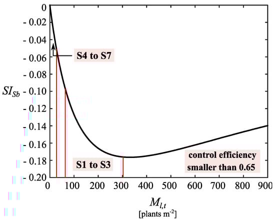 Index SISb indicating the sensitivity of the barley seed production to L. rigidum adult plants Ml,t. Variation ranges corresponding to the long-term infestation levels reached by using control programs S1–S7 are also indicated.
